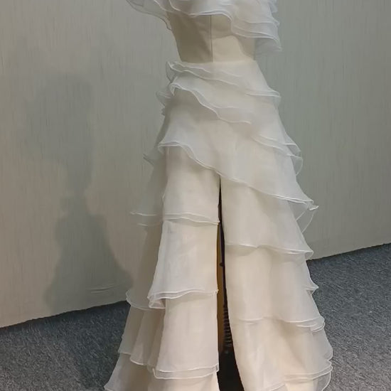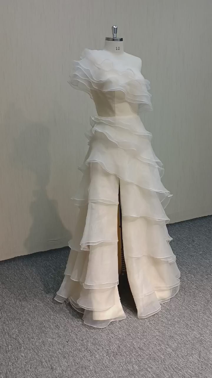 Ethereal and artfully sculpted, the Celestia Cascade Gown is a custom, made-to-order bridal masterpiece that floats with every step. Crafted from the finest silk chiffon, this floor-length gown features tiered ruffles that cascade diagonally across the silhouette—creating movement, depth, and romantic drama from every angle.